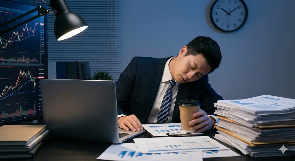 ▲ Alt 태그: 주식 분석에 지쳐 잠든 직장인의 현실