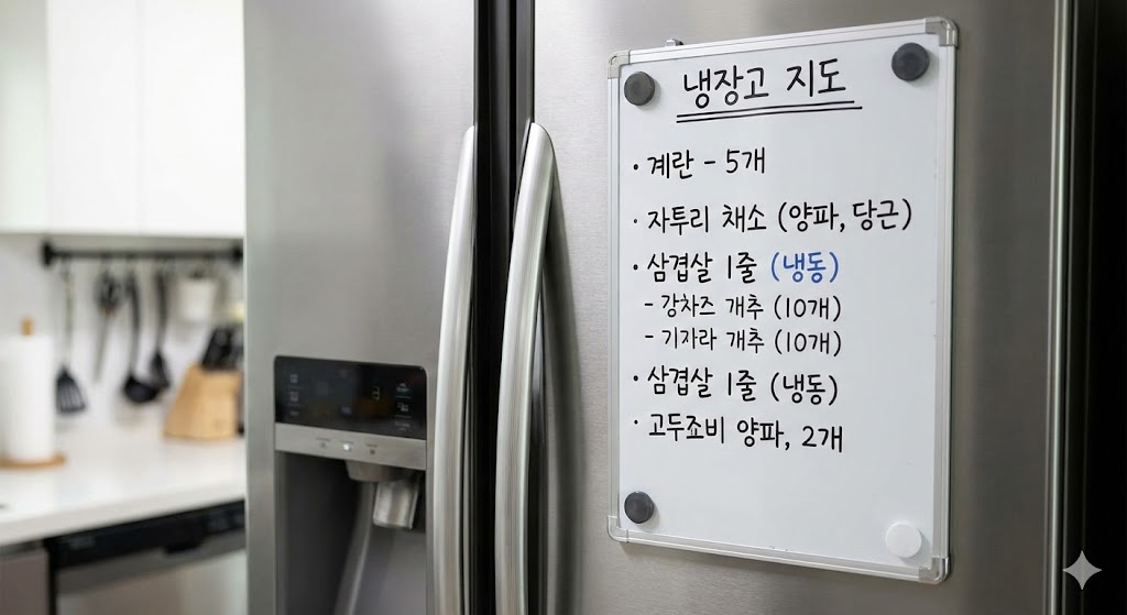 이렇게 냉장고 속 재료로 만들 수 있는 요리를 먼저 정하고, 꼭 필요한 재료만 장보기 리스트에 적었습니다. ‘냉장고 지도’를 그려 문 앞에 붙여두니 어떤 재료가 얼마나 남았는지 한눈에 보여 식재료 관리가 훨씬 수월해졌습니다.